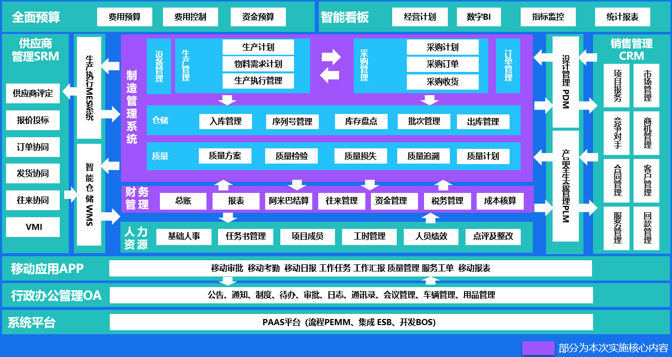 以ERP订单为核心,从CRM开始,到订单成本预测,到研发,生产,发货,开票,收款及实际成本核算,实现全链条管理,通过规范订单全过程管理。整体运营效率提升30%